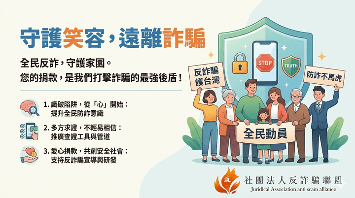 本會依據相關法律規定成立,旨在促進反詐騙信息的宣導,提升公眾對詐騙手法的認識,以防止受害事件的發生。